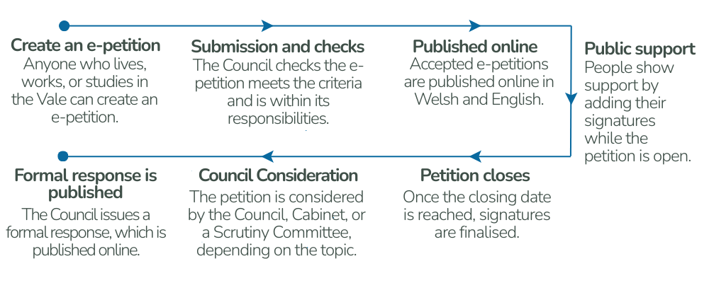 When an e-petition is submitted, the Council's Monitoring Officer or Deputy Monitoring Officer checks that it meets the criteria. If it does, the Council will publish it online in both Welsh and English. People can then show their support by adding their signature.