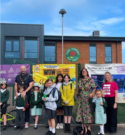 Pupils at Ysgol Sant Baruc in Barry celebratedWalk to School Week2025 as part of their ongoing participation in WOW – the walk to school challenge from Living Streets. The Mayor of the Vale of Glamorgan, Naomi Marshallsea, joined the school run to highlight the many benefits of active travel for children, families and the wider community. Since joining the WOW programme in September 2023, the school has seen a 57% reduction in car journeys to the school gate, with 22% of pupils regularly walking all the way. Funded by Welsh Government, the project supports sustainable travel and healthier lifestyles, with pupils recording their journeys and earning monthly badges for walking, wheeling, cycling, scooting or ‘Park and Stride’.